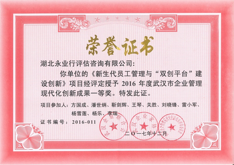 2018年1月10日,武汉企业联合会、武汉企业家协会向社会正式发布武汉市第三十届(2016年度)企业管理现代化创新成果获奖项目,其中一等奖 12项、二等奖 43项、三等奖 19项。此次评选中,永业行作为民营企业与在汉央企、本地大型国企进行角逐, 参评的 “新生代员工管理与 ‘双创平台’ 建设创新” 最终获得一等奖,是唯一获奖的咨询评估机构。