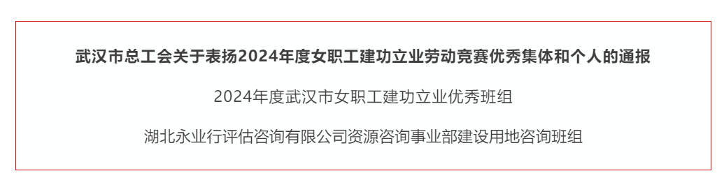 近日,武汉市总工会开展的2024年度武汉市女职工建功立业劳动竞赛优秀集体和个人评选结果揭晓,经各级工会遴选、推荐、申报及综合评定,湖北永业行评估咨询有限公司资源咨询事业部建设用地咨询班组获评“2024年度武汉市女职工建功立业优秀班组”。